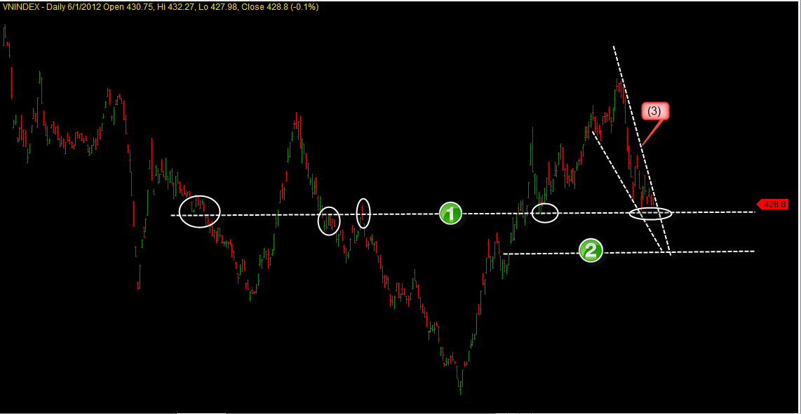 Với phiên giao dịch ngày cuối tuần, chỉ số VN-Index đã có 10 phiên giao dịch nằm trên 430 – 450 điểm. VN-Index vận động theo mẫu hình Falling Wedge (3) như hình vẽ và đang ở trên vùng kháng cự của mẫu hình này. Như vậy, khả năng thị trường sẽ sớm có những phiên tăng mạnh hoặc giảm mạnh để thoát ra khỏi trạng thái đi ngang hiện tại. Dò đáy thời gian chúng tôi thấy rằng ngày 4/6/2012 có thể là đảo chiều của mẫu hình đi ngang này. Do vậy, chúng tôi cho rằng trong tuần này, chỉ số VN-Index sẽ có những phiên biến động với biên động tăng hoặc giảm mạnh. Nếu giảm mạnh, mốc hỗ trợ sẽ là vùng giá quanh khu vực 410 điểm (Gap tăng giá hình thành tại ngưỡng hỗ trợ số (2) đồ thị và chưa xuất hiện Fill gap). Chúng tôi vẫn lạc quan và cho rằng vùng giá 410- 430 điểm là khu vực tạo đáy của chỉ số VN-Index.